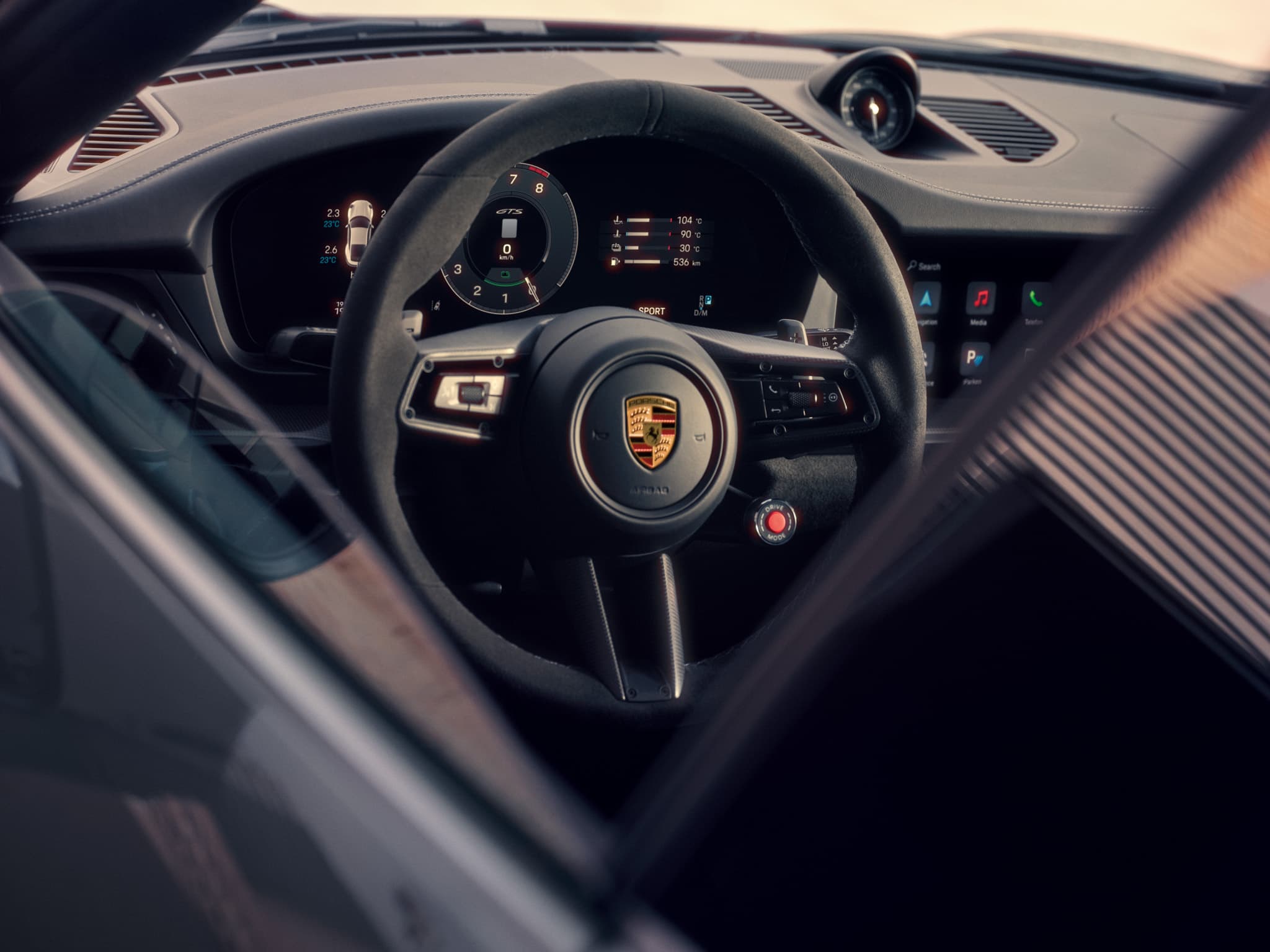 The instrument cluster with 12.65-inch curved display puts the focus on the central tachometer with the classic five-tube view or the reduced Sport Chrono screen1 as desired.